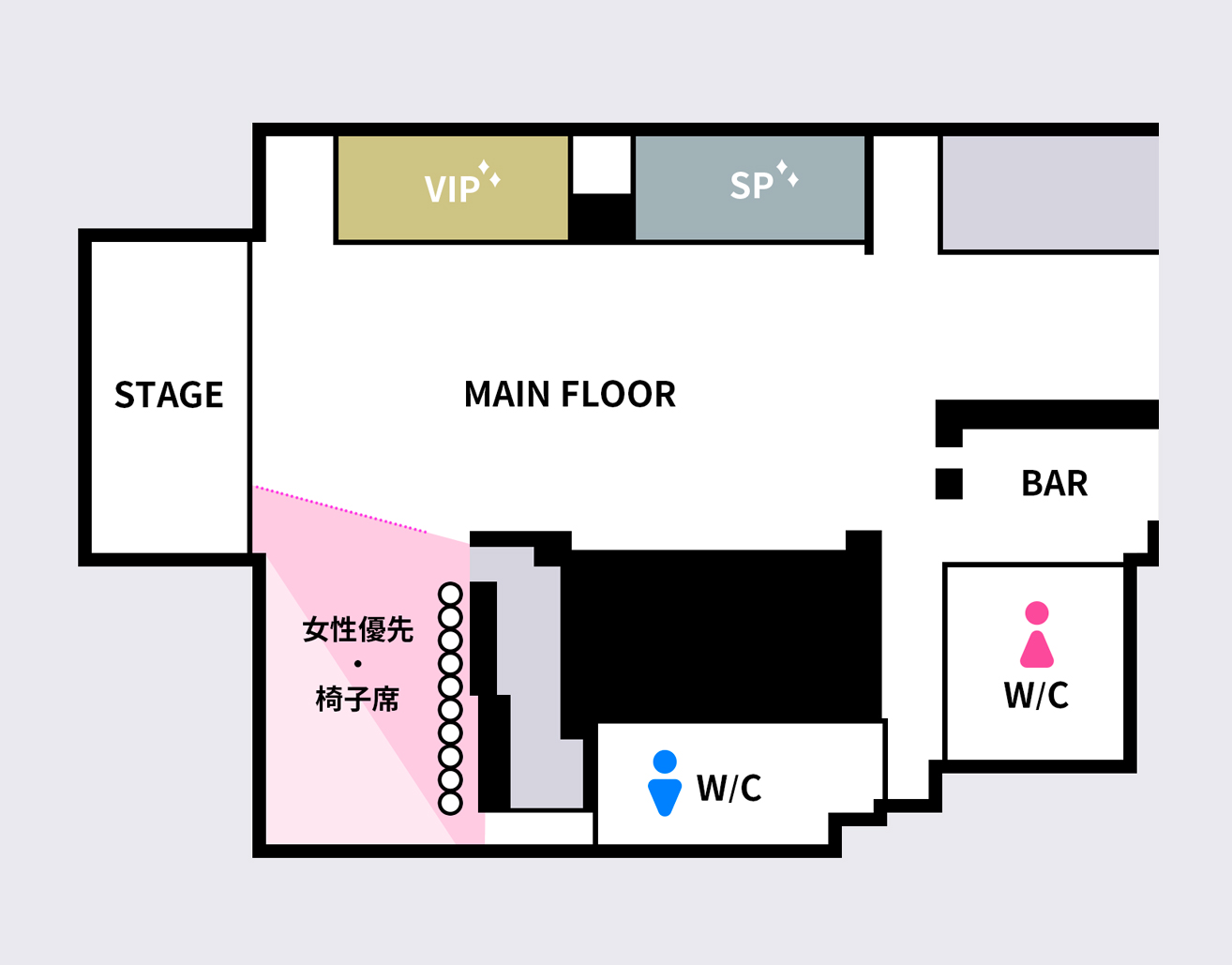 ※着席状態ならびにエリアの一部からはステージが見づらい場合がございます。予めご了承くださいませ。